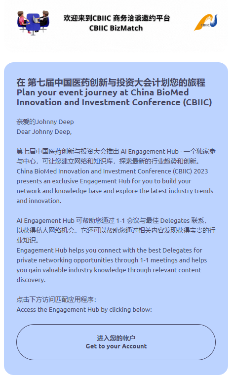 平台上线后,您的注册邮箱将收到邀请邮件,请点击【进入您的账户】或扫描二维码进入一对一企业商务洽谈邀约系统(扫描进入需要填写登录密码,登录密码会随邮件一同发送),手机和电脑端均可使用。
