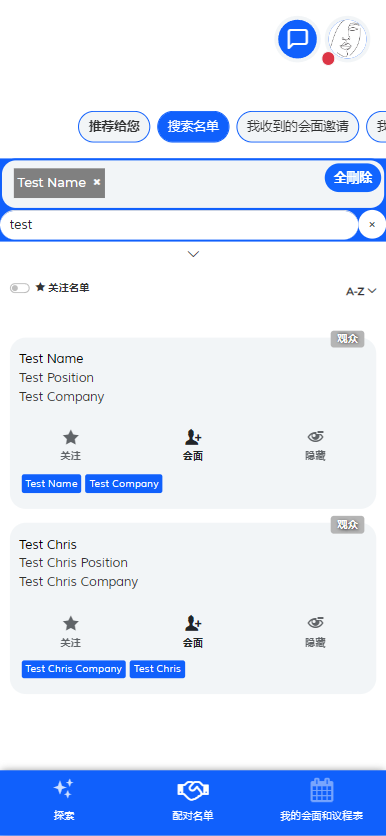 在搜索栏进行检索,或在分类列表提供您的兴趣企业类型,系统将帮您找出合适的预约方。在您登录平台后,系统通常会把适合与您会面的参会者列在前面。