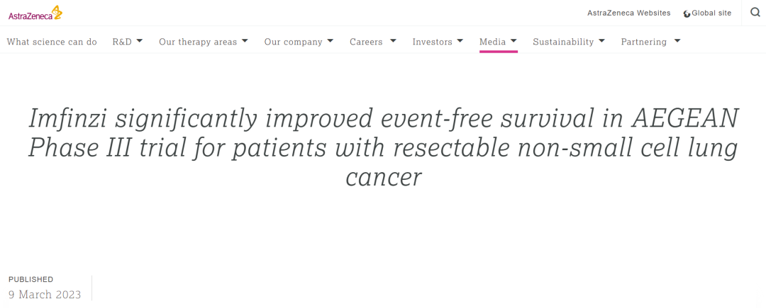 3月9日,阿斯利康宣布,度伐利尤单抗(Imfinzi)新辅助/辅助治疗可切除的早期非小细胞肺癌(NSCLC)的III期AEGEAN研究在中期分析中达到第二个主要终点,即与安慰剂组相比,Imfinzi组患者的无事件生存期(EFS)显著延长。第一个主要终点(病理学完全缓解率)已于2022年6月达到,最新的pCR和mPR数据亦与先前一致。