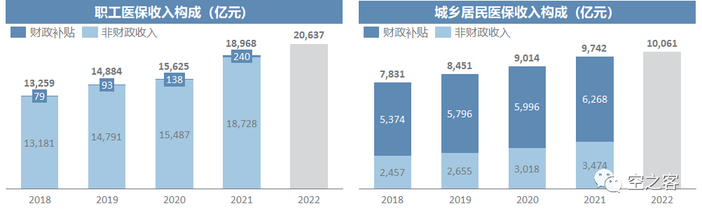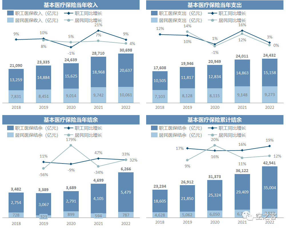 从整体数字来看,医保资金的健康状况是明确在不断改善而非恶化的:收入端除了20/21两年因减免征收等波动影响,基本都保持着稳定增长,CAGR约10%;支出端基本是在量入为出原则,增速低于收入,CAGR约8%;于是结余有了明显增厚,特别是在近两年随着各种控费措施落地实施后结余持续增加,2022年的当年结余6,000多亿几乎比2018年医保局成立时翻番,累计结余超过4万亿。不过拆开看还是会发现,职工医保相对更加健康,收入和结余增速都更快;而城乡居民医保则压力大很多,筹款能力显著偏低、且有持续下滑之势,结余也少很多、且不稳定。