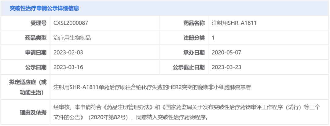 3月16日,中国国家药监局药品审评中心(CDE)官网最新公示,恒瑞医药以HER2为靶点的抗体偶联药物(ADC)注射用SHR-A1811拟纳入突破性治疗品种,适应症为:单药治疗既往含铂化疗失败的HER2突变的晚期非小细胞肺癌(NSCLC)患者。值得一提的是,该药另外两项适应症已于今年2月被CDE纳入突破性治疗品种,分别用于:HER2低表达的复发或转移性乳腺癌,以及HER2阳性的复发或转移性乳腺癌。