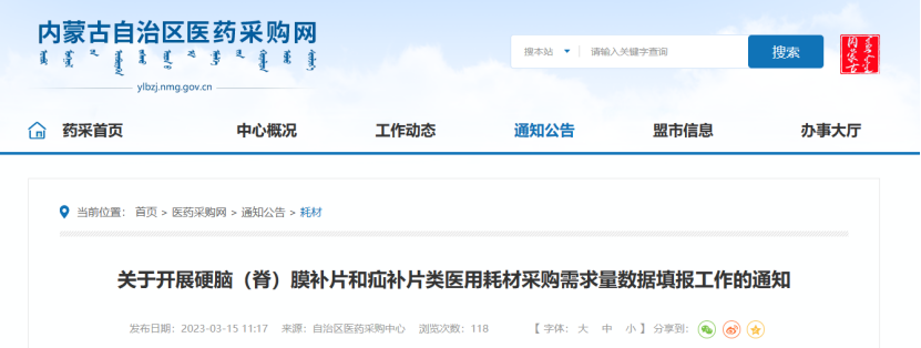3月15日,内蒙古自治区医药采购中心发布《关于开展硬脑(脊)膜补片和疝补片类医用耗材采购需求量数据填报工作的通知》,根据“八省二区”省际联盟补片类集中带量采购联合办公室工作安排,开展硬脑(脊)膜补片和疝补片类医用耗材采购需求量填报工作。