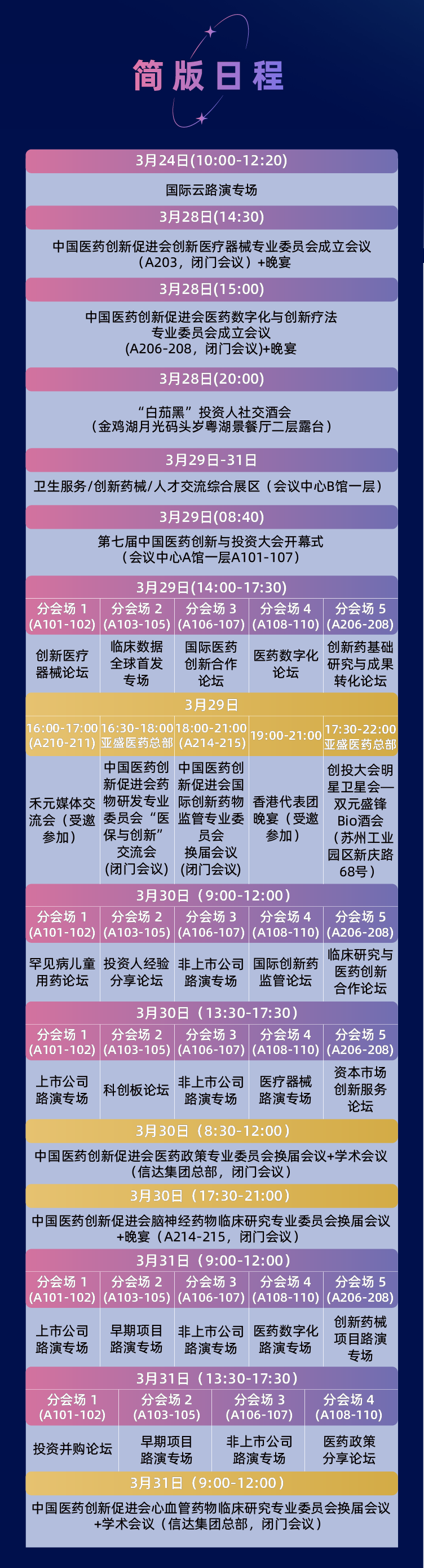 第七届中国医药创新与投资大会(以下简称“创投大会”)将于3月29日与您相见!为了您能更快明晰大会细则,主办方已为您准备好详尽的参会攻略。一文解惑,深度参会攻略敬请查收!会议信息