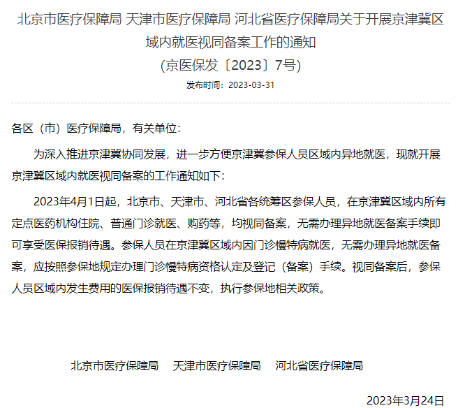 3月31日,北京、天津、河北三地医保部门联合发出《关于开展京津冀区域内就医视同备案工作的通知(京医保发〔2023〕7号)》。