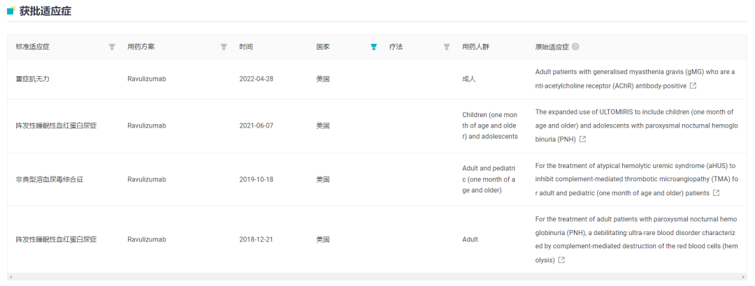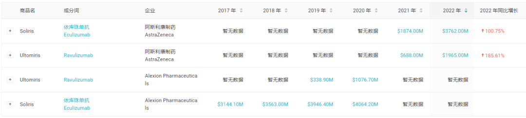 据 Insight 数据库显示,Ultomiris 最早在 2018 年度首先在美国获批,当前已经批准 3 大适应症:阵发性睡眠性血红蛋白尿症(PNH)、非典型溶血尿毒综合征(aHUS)和重症肌无力,22 年销售额已攀升至 19.65 亿美元,同比增长 42%。