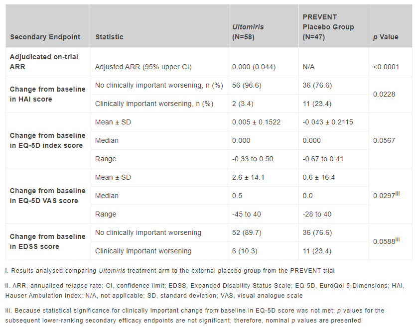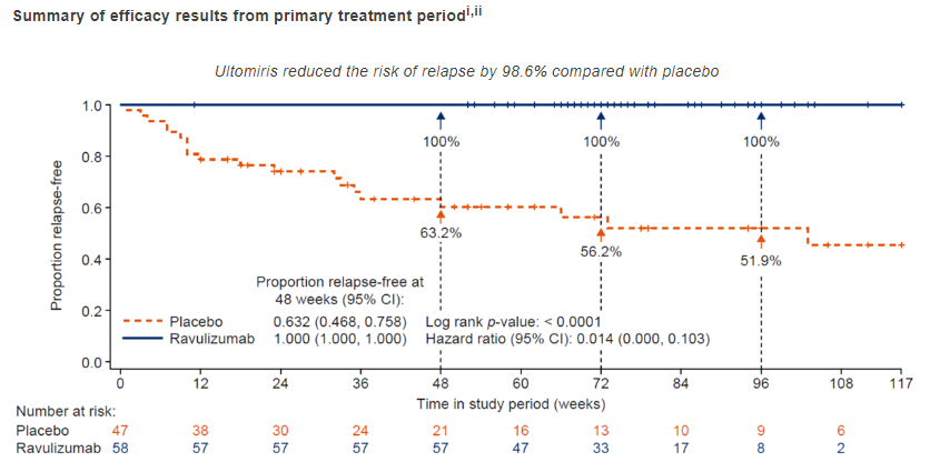结果显示,中位治疗 73 周,Ultomiris 治疗的患者中观察到零判定复发(复发风险降低:98.6%,HR (95% CI) = 0.014 (0.000,0.103),p<0.0001)。此外,接受 Ultomiris 治疗的患者在 48 周时 100% 无复发,而外部安慰剂组患者为 63%。