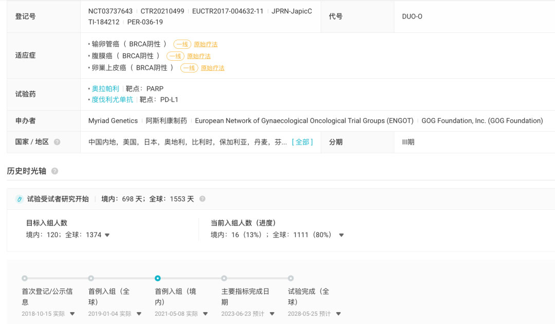 DUO-O 研究是一项随机、双盲、安慰剂对照 III 期试验,旨在评估 Imfinzi 联合含铂化疗、贝伐珠单抗后给予 Imfinzi 和贝伐珠单抗(伴或不伴 Lynparza)维持治疗,在新确诊的无肿瘤 BRCA 突变的晚期卵巢癌患者中的疗效和安全性。