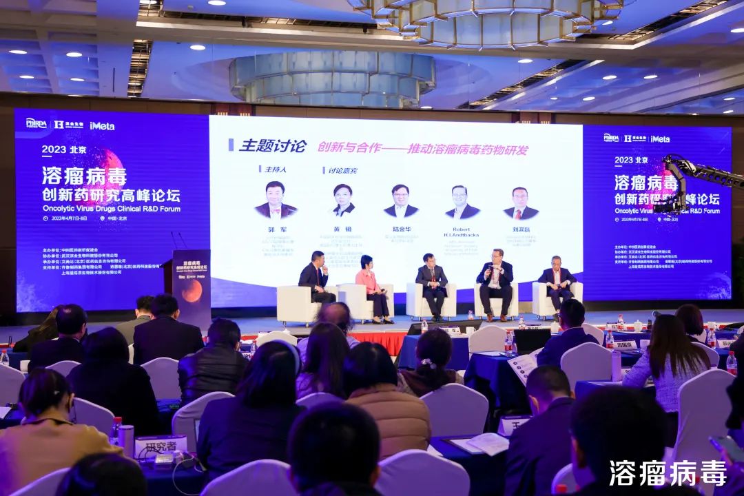 论坛现场,专家围绕“创新与合作——推动溶瘤病毒药物研发”这一主题开展了讨论。主题讨论由郭军教授主持,黄镜教授、陆金华博士、Robert教授、刘滨磊博士参与讨论,嘉宾们对溶瘤病毒药物研发现状、创新要点、前景展开了深入的探讨,为与会嘉宾提供了新视角和新观点。