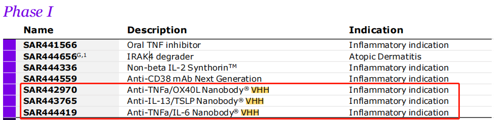 从管线布局来看,除了SAR444200,还有三款基于NANOBODY技术开发的纳米抗体进入临床,均处于临床I期。