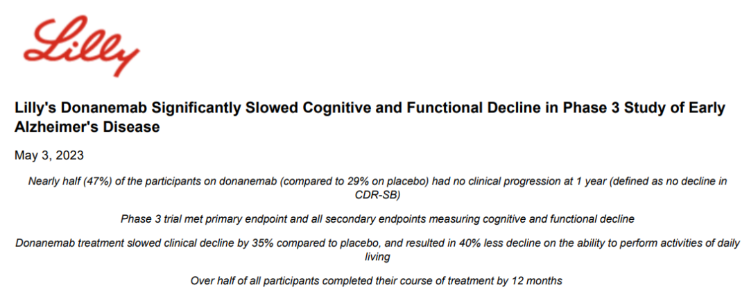 5月3日,礼来宣布donanemab治疗早期症状性阿尔茨海默病(AD)患者的III期TRAILBLAZER-ALZ 2研究达到了主要终点。结果表明,donanemab能显著减缓早期症状性AD患者的认知功能下降,近一半受试者(47%)在1年内没有疾病进展(定义为临床痴呆评分没有下降),而安慰剂组为29%。礼来预计本季度向FDA递交donanemab的上市申请,以寻求加速批准。