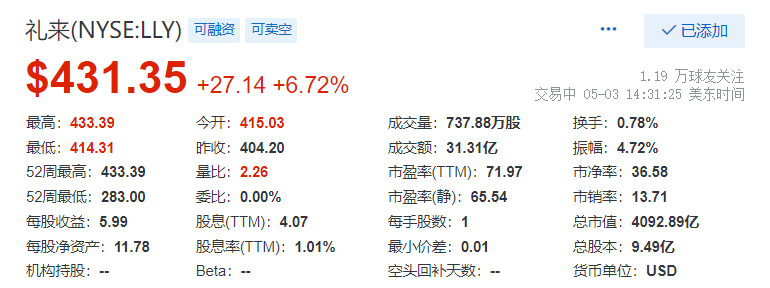 该消息公布后,礼来股价大涨6%,市值突破4000亿美元,超越诺和诺德(3780.7亿美元)成为纯药企市值第一名。