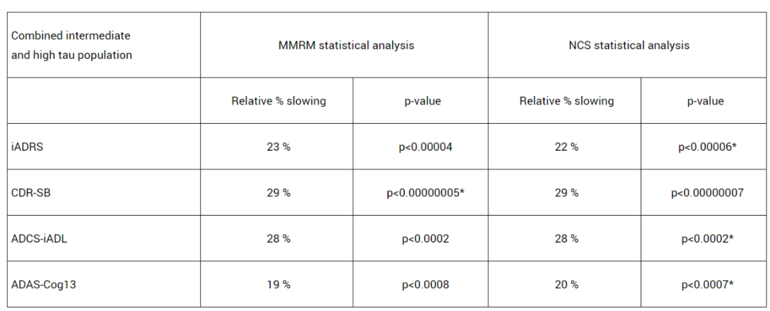 将tau蛋白水平中等人群与较高人群(n=552)结果合并分析后(n=1736),donanemab治疗组仍在所有临床终点中显示出有积极结果(p<0.001),其中CDR-SB评分和iADRS评分分别将下降速度减缓29%和22%。