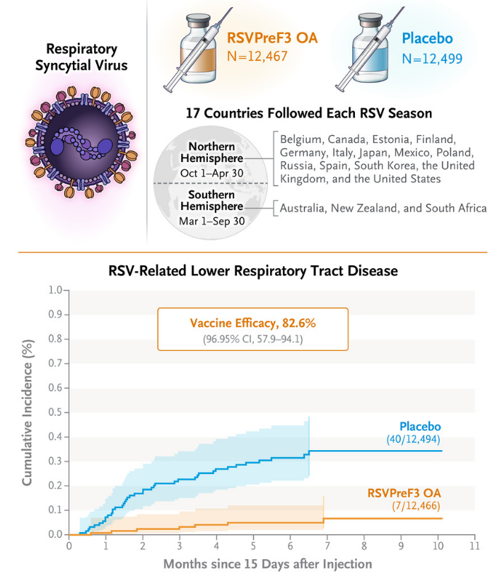 这项在60岁及以上的个体中进行单剂量注射的RSV疫苗的安全性和有效性评估3期临床试验中。12467名参与者接受了RSV疫苗Arexvy的接种,12499名参与者接受了安慰剂。结果显示,疫苗将发生RSV相关下呼吸道疾病风险降低了82.6%,将发生严重RSV相关下呼吸道疾病的风险降低了94.1%。