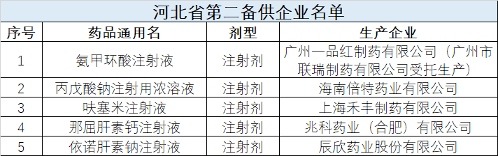 其中,山东、辽宁、天津、安徽、内蒙古、四川、河北等7省已发布针对氨甲环酸注射液、丙戊酸钠注射用浓溶液等5个易短缺品种的第二备供企业中选结果(7省完整中选名单见文末附1)。