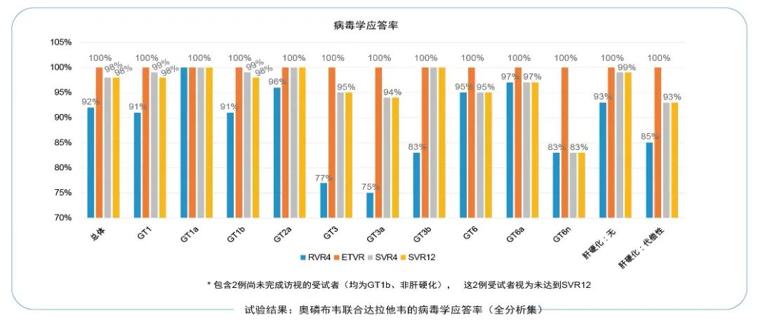 治疗结束后随访期:在治疗结束后第4周时,98%的受试者获得了SVR4。在治疗结束后第12周时,98%的受试者获得了SVR12,其中GT3型受试者SVR12为95%(GT3a SVR12 94%,GT3b SVR12 100%)。治疗结束后第24周时,在治疗结束后12周基础上未新增复发受试者。