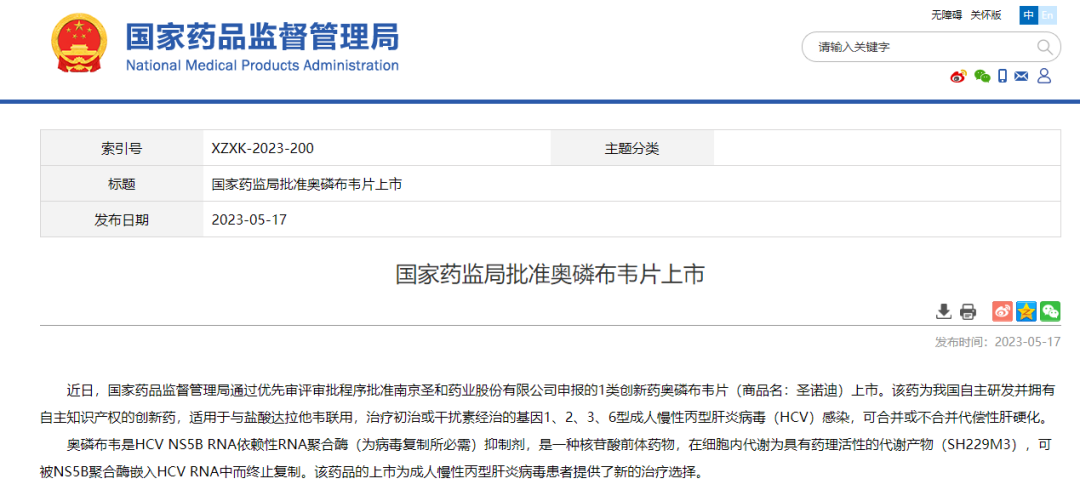 国家药监局官网最新数据显示:2023年05月12日,南京圣和药业股份有限公司自主研发的化学1类创新药品种「奥磷布韦片」(受理号:CXHS2000042)按照优先审评审批程序获得NMPA批准上市。奥磷布韦片是国内首个拥有自主知识产权的NS5B抑制剂,属于泛基因型慢性丙肝治疗直接抗病毒药物(Direct antiviral agent, DAA),与盐酸达拉他韦联用,治疗初治或干扰素经治的泛基因型成人慢性丙型肝炎病毒(HCV)感染,可合并或不合并代偿性肝硬化。
