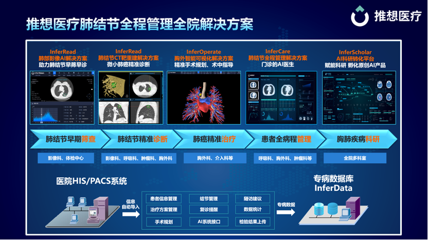 推想12款AI全场景解决方案包括临床高通量的胸肺部领域应用,医院场景实际应用和智慧云平台三大方向。智能影像赋能全院,覆盖癌症、感染性疾病、心血管疾病、脑血管疾病及创伤等多个疾病领域,不断深入临床拓展,沿着患者诊疗全流程开发“筛、诊、治、管、研”全流程智慧解决方案。