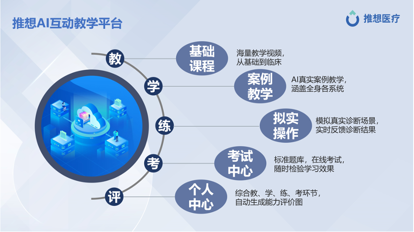 推想AI互动教学平台是公司最新打造的致力于医学AI的专业教学系统。 “AI+医学教育”将是时代发展的方向,推想医疗提出通过建设国家级人工智能医学影像教培中心,用AI赋能影像学人才培养,真实还原临床教学场景,缩短学员学习曲线;通过构建CDSS临床路径和知识库,帮助影像科医师实现自主查询,以AI赋能阅片能力提升、辅助临床诊疗、以AI完成培训评价体系,为医学院校和毕业后教育市场提供知识库,推动智能教培平台的发展。