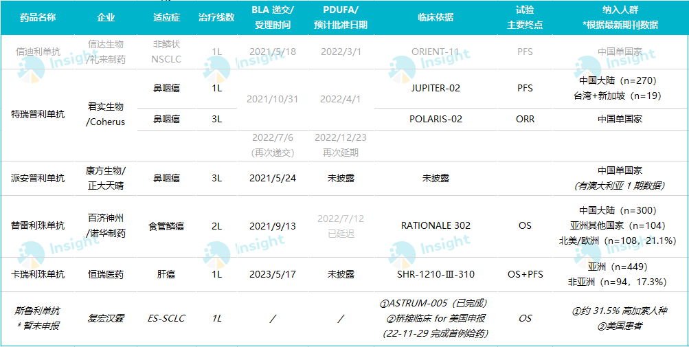 国产 PD-1 们胜算几何?我们来一起看看注册临床依据。由于 FDA 对信达提出的疑问主要基于终点设置、入组人群和对照药,Insight 以此维度做了整理: