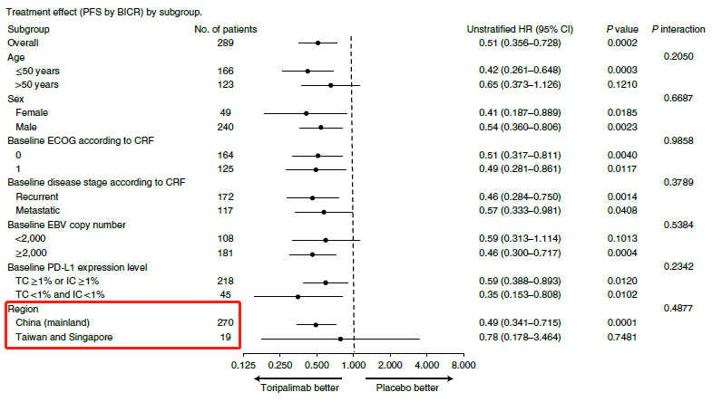 研究结果显示,对于未接受过系统性治疗的复发或转移性 NPC 患者,与安慰剂联合化疗组相比,特瑞普利单抗联合化疗组中位无进展生存期(PFS)显著延长,为 21.4 vs. 8.2 个月,延长 13.2 个月,并且特瑞普利单抗联合化疗可降低 48% 的疾病进展或死亡风险(HR=0.52,95%CI:0.37-0.73,双侧 p<0.0001)。