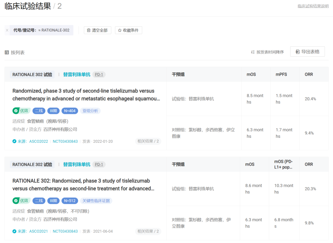替雷利珠单抗用于食管鳞癌的 BLA 基于 RATIONALE 302 临床试验的结果,这是一项随机、开放性、多中心的全球 3 期试验(NCT03430843),旨在评价百泽安®相比研究者选择的化疗方案用于晚期或转移性 ESCC 患者二线治疗的有效性和安全性。
