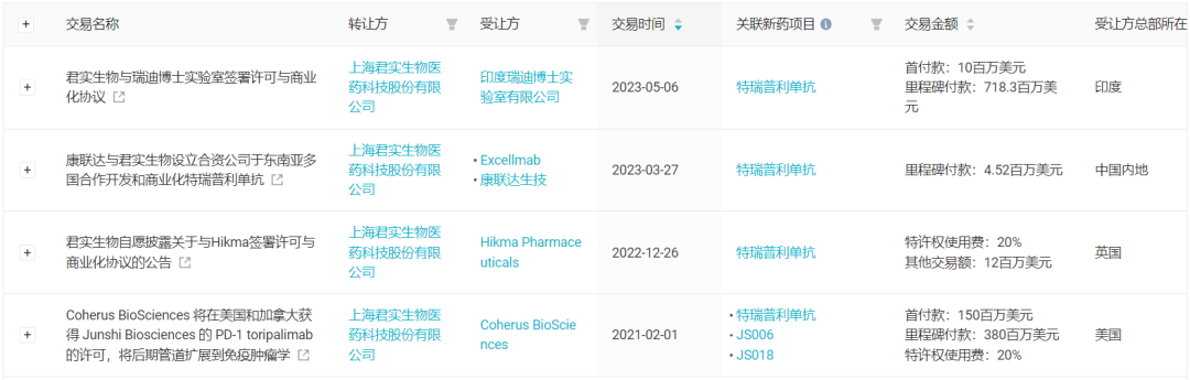 君实生物将特瑞普利单抗的北美和加拿大权益授予 Coherus,欧洲则自主提交上市申请;此外,从去年年末到今年初,又通过 3 笔交易将海外布局拓展到了中东、南非、北非、东南亚等地区。