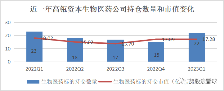 从市值来看,生物医药企业为17.28亿美元,占全部持仓的30.64%,位居所有行业第二。虽然行业持仓数量高于去年四季度,但占全部持仓的比例略有下降,主要原因是以互联网为主大科技行业在一季度的表现略好于生物医药。