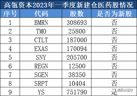 除了上述规律,总体而言,一季度,高瓴资本在生物医药领域的建仓多只绩优医药股,如BMRN、赛诺菲、再生元、SGEN、赛默飞、EXAS等,与当前市场偏好有一定关系。