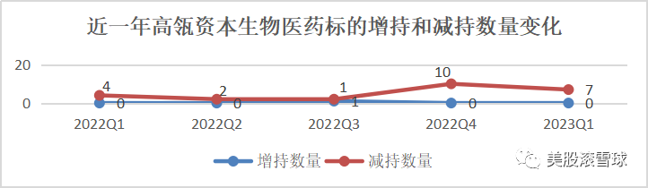 近一年来,高瓴资本在生物医药领域的减持次数达24次,而增持仅有1次。逐季来看,增持次数则一直维持在较低水平,一定程度上反映出高瓴资本对此前持有的尚处于研发阶段的Biotech公司不看好。
