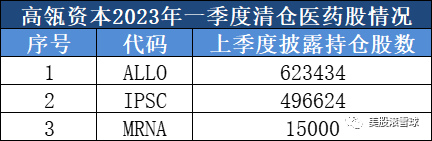 在清仓标的选择上,被清仓的ALLO、IPSC和MRNA均是上季度末持仓市值较低的医药股,符合此前高瓴资本重点清仓1000万美元持仓市值以下的标准。