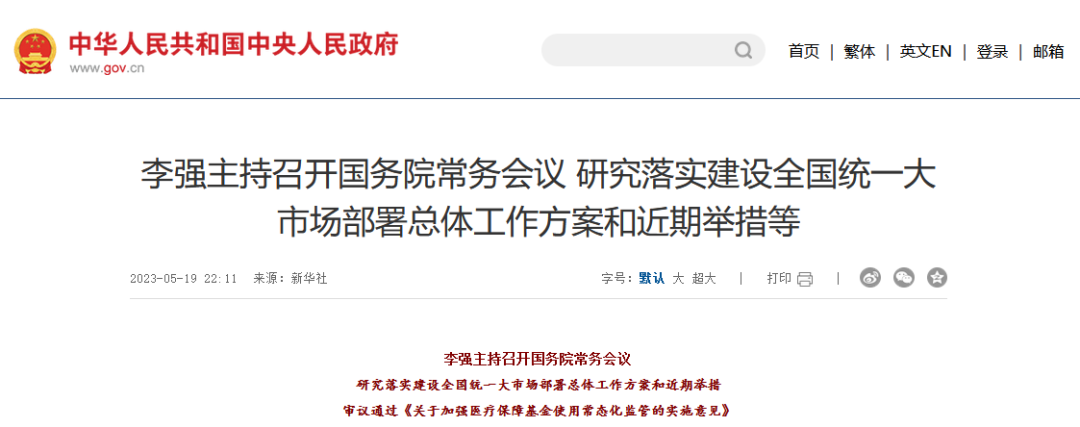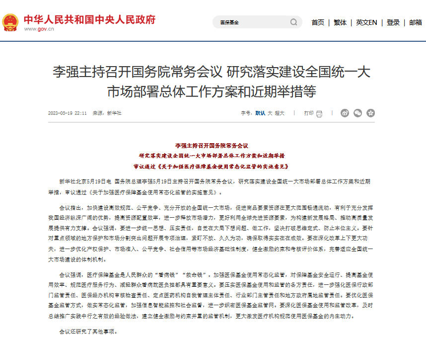 5月19日,国务院总理主持召开国务院常务会议,研究落实建设全国统一大市场部署总体工作方案和近期举措,审议通过《关于加强医疗保障基金使用常态化监管的实施意见》。
