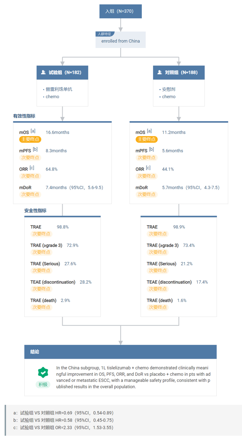 在 2023 AACR 上发布的中国亚组数据显示,截至 2022 年 2 月 28 日,替雷利珠单抗+化疗组(n=182)和安慰剂+化疗组(n=188)中位随访时间分别 15.8 个月和 10.6 个月,替雷利珠单抗组观察到了更长的 OS,相较于安慰剂组分别是 16.6 个月 vs 11.2 个月,风险比 0.69(95% CI: 0.54, 0.89);中位 PFS 分别为 8.3 个月 vs 5.6 个月,风险比 0.58(95% CI: 0.45, 0.75)。