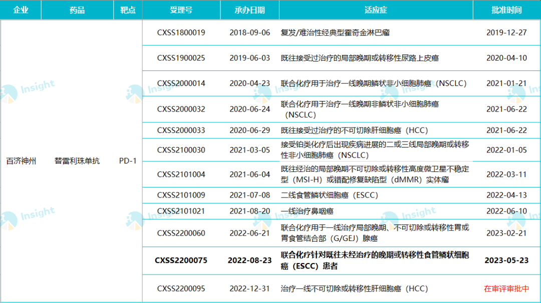5 月 23 日,根据 NMPA 最新批件,百济神州 PD-1 替雷利珠单抗的第 11 项适应症获批上市。本次获批的适应症为:联合化疗针对既往未经治疗的晚期或转移性食管鳞状细胞癌(ESCC)患者。