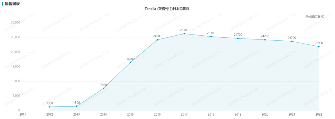 原研是田边三菱制药开发的DPP-4抑制剂Tenelia。2012年9月,该药首次在日本获批上市,随后在韩国等国家和地区获批,2021年8月在中国批准上市,用于治疗2型糖尿病患者,自上市以来销售额如下图所示。