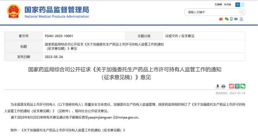 在千呼万唤中,5月24日,《关于加强委托生产药品上市许可持有人监管工作的通知(征求意见稿)》正式出炉。