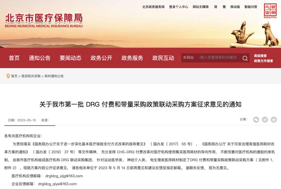 2023年5月10日,北京市医保局发布消息称,首都医科大学附属北京安贞医院、北京积水潭医院、首都医科大学附属北京天坛医院、中国医学科学院阜外医院、北京大学第三医院和首都医科大学宣武医院六家医院组成医疗机构DRG联动采购集团,将针对运动医学类、神经介入类、电生理类医用耗材进行DRG付费和带量采购政策联动采购。