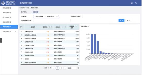 通过结算清单质控系统,医保端可以按照时间段查询全市所有医疗机构的清单入组情况,整体把控清单入组质量,明确存在的主要问题数量和类型。例如下图所示,为2021年8月期间淮安市医保结算清单质控结果统计情况,数据显示,问题单据总数排名前3的规则名称分别为“必填项非空校验”“住院诊疗信息逻辑校验”和“医疗收费信息逻辑校验”。另一方面,建立动态公示反馈功能,及时将清单问题推送给医疗机构,让每一家医疗机构也能看到自己入组清单问题的具体数据,也就能有针对性地加强管理,提高入组质量。通过这种闭环管理,不仅能够显著提高入组准确率,保证病种对应分值的正确性;同时,也让定点医疗机构更好地参与到DIP支付改革,进一步促进医疗机构病案首页的书写质量的提升,提高医疗质量、绩效等数据的真实性。据淮安市医保局统计,通过做好清单入组质控,让当地所有医疗机构的病案质量有了显著改善,2022年最新统计数据显示,医疗机构病案的不完整清单占比由上一年度的23.7%同比下降至7.3%。