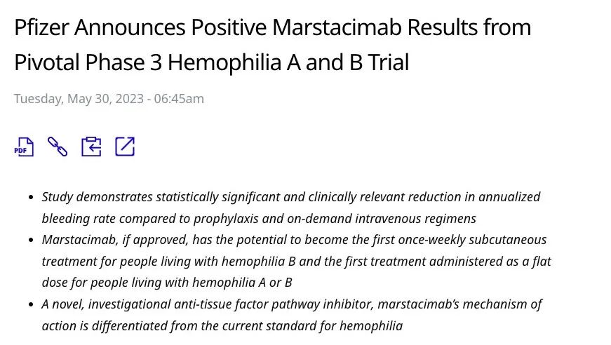 5 月 30 日,辉瑞宣布其在研 TFPI 单抗 Marstacimab 治疗 A 型和 B 型血友病的关键 III 期临床 BASIS 研究达到主要终点。Marstacimab 有望成为首个针对 B 型血友病患者的每周一次非因子皮下注射疗法,以及首个针对 A 或 B 型血友病患者的固定剂量疗法。