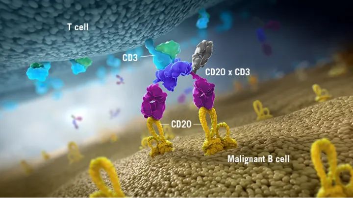 Columvi(Glofitamab)是一种2:1型结构的CD20/CD3双抗,具有两个与CD20结合的“ Fab”区域和一个与CD3结合的“ Fab”区域,这种新颖结构设计使其与B细胞表面CD20的结合性更高,诱导快速T细胞活化、细胞因子释放,以及导致靶细胞裂解。