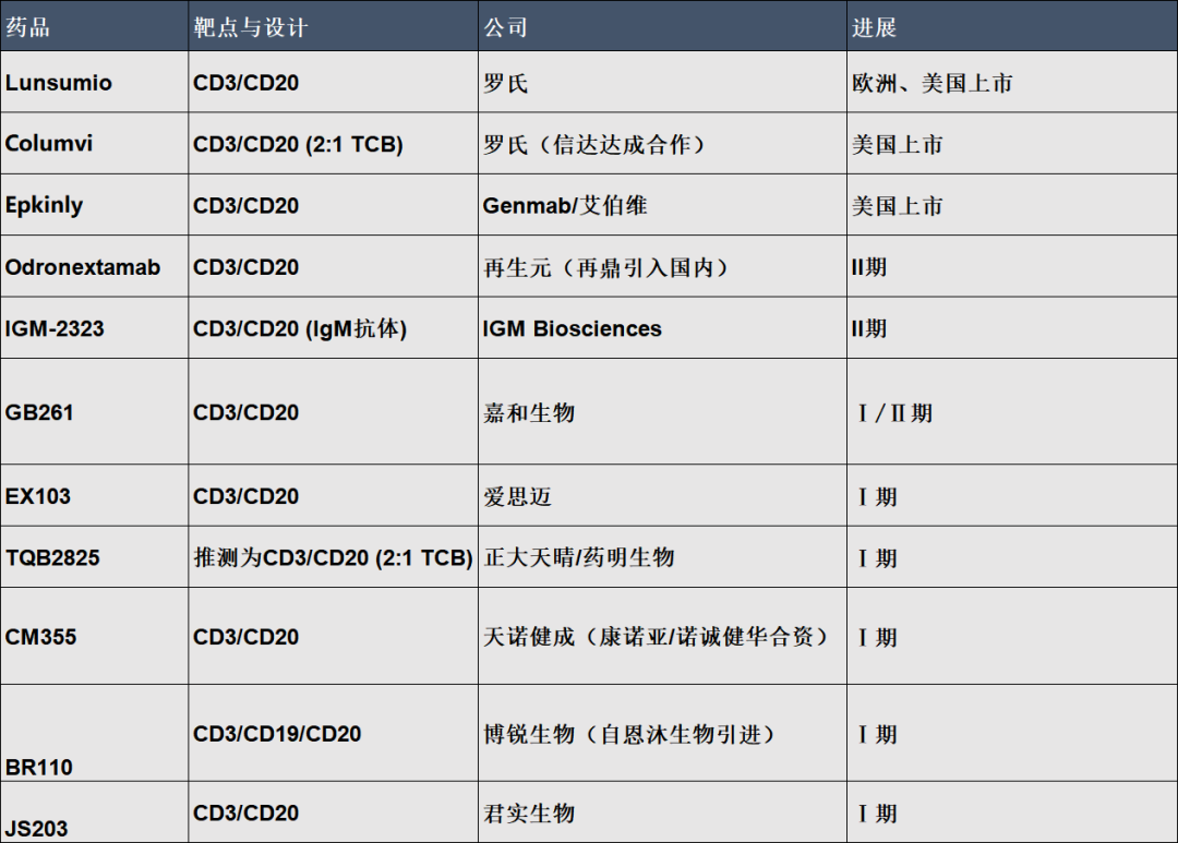 就血液肿瘤而言,CD20xCD3当下最为热门的双抗组合。国内方面,爱思迈,正大天晴,康诺亚/诺诚健华,天广实,嘉和生物等快速跟进布局。除了合作开发/引进的产品进展较快外,国内大多数CD20/CD3双抗都处于临床Ⅰ期阶段。