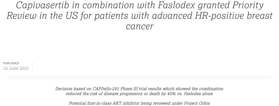 该项NDA也正在接受Orbis项目的审查,该项目是FDA的一项倡议,旨在为参与的国际合作伙伴之间同时提交和审查肿瘤药物提供框架,以加快药物在全球的审批。Capivasertib是三种AKT亚型(AKT1/2/3)的高效选择性抑制剂。AKT信号通路的激活,包括PIK3CA、AKT1和PTEN的改变,可出现在许多HR+/HER2-的晚期乳腺癌患者中,但也可能出现在没有这些基因改变的患者中。AKT信号通路与内分泌治疗耐药的发生有关。该项NDA是基于一项代号为CAPItello-291的III期试验数据,该研究结果已于最近在线发表于《新英格兰医学杂志》上。CAPItello-291研究是一项全球、多中心、双盲、随机的III期临床试验,共纳入708例患者,旨在评估capivasertib+氟维司群对比安慰剂+氟维司群治疗HR+/HER2-晚期乳腺癌患者的疗效和安全性,这些患者在接受AI治疗期间或之后疾病复发或进展。研究允许患者既往接受过CDK4/6抑制剂治疗(至少51%),但既往未接受过SERD、mTOR抑制剂、PI3K抑制剂或AKT抑制剂。