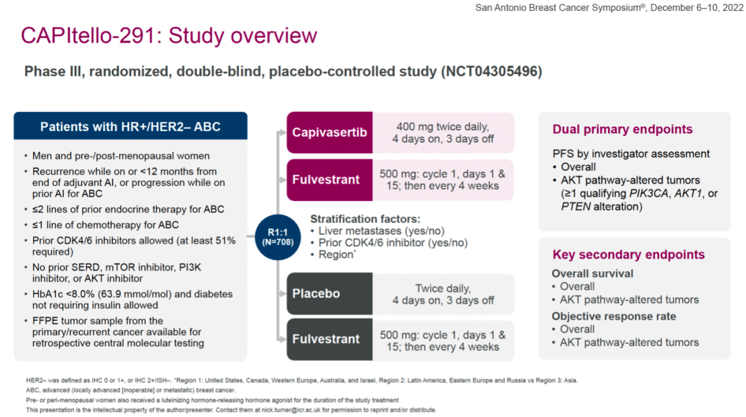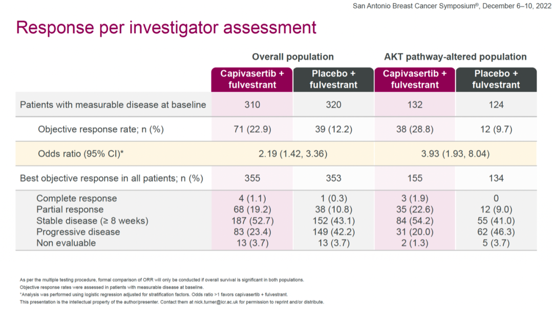 ORR方面,全体人群中capivasertib+氟维司群组和安慰剂+氟维司群组的ORR分别为22.9%和12.2%;AKT通路改变人群中,两组的ORR分别为28.8%和9.7%,OS数据尚未成熟(28%的总体成熟度)。