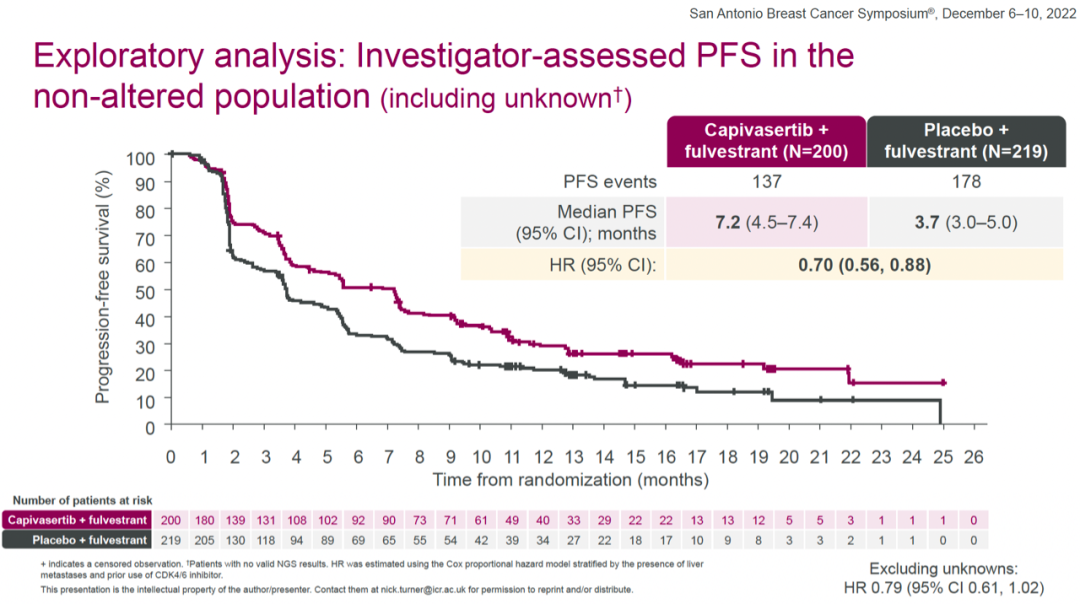 探索性分析显示,在AKT通路未改变人群中(包括状态未知),两组的中位PFS分别为7.2个月和3.7个月,HR=0.70(0.56-0.88)。