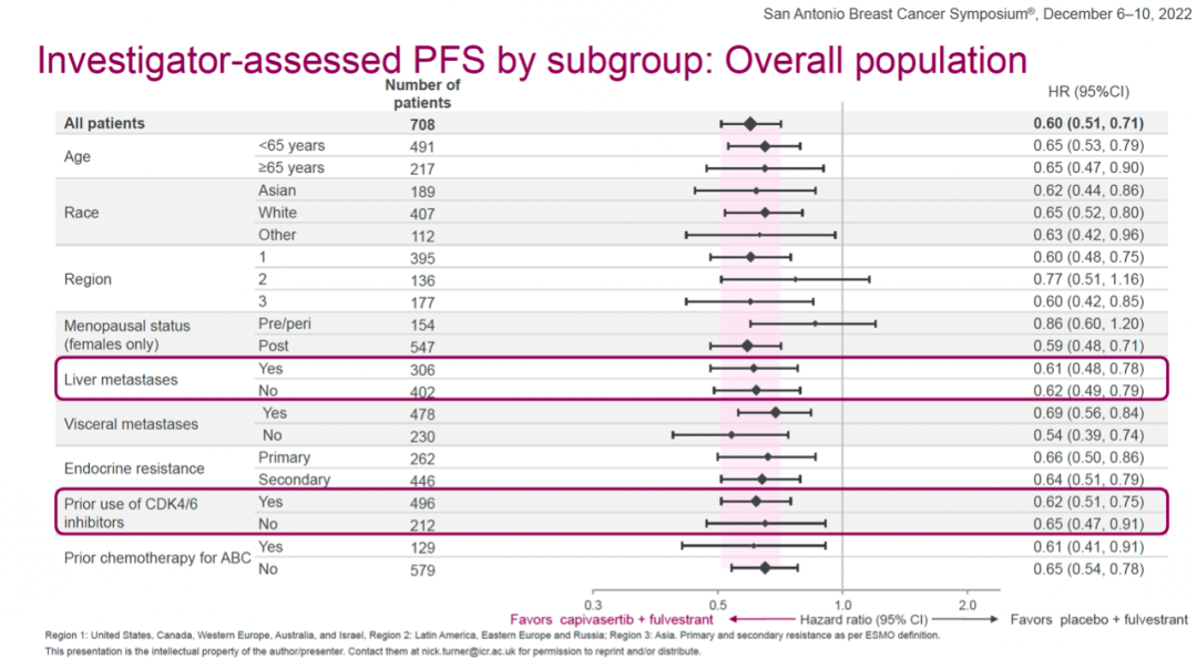 不论是否存在肝转移或既往接受过CDK4/6抑制剂治疗,capivasertib+氟维司群组的HR均有优势。