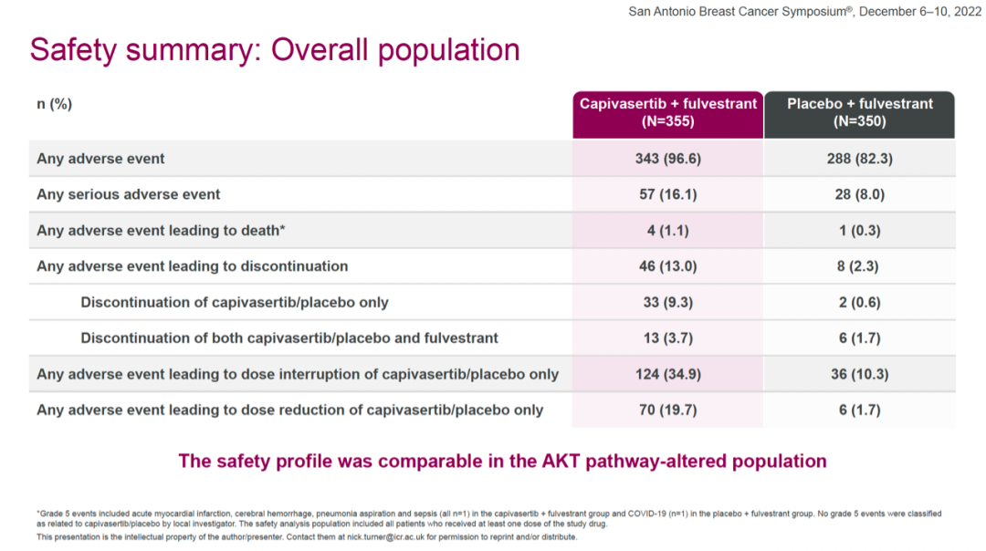安全性方面,总体人群中,capivasertib+氟维司群组和安慰剂+氟维司群组出现任何不良事件的比例分别为96.6%和82.3%;任何严重不良事件的比例分别为16.1%和8.0%;任何不良事件导致治疗中止的比例分别为13.0%和2.3%。常见不良反应包括腹泻、恶心、皮疹、疲劳、呕吐、头痛等。