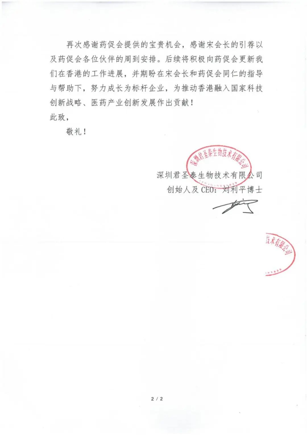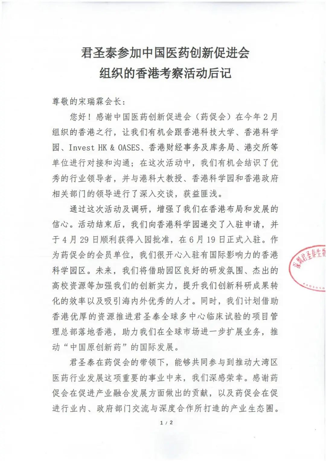 2月26-27日,受中国香港特区政府相关机构邀请,中国医药创新促进会(以下称“我会”)组织创新企业代表团到香港进行考察交流。近日,考察活动结出的硕果落地,我会会员单位深圳君圣泰生物技术有限公司向香港科学园递交入园申请,顺利获批,并于6月19日正式入驻香港科学园。
