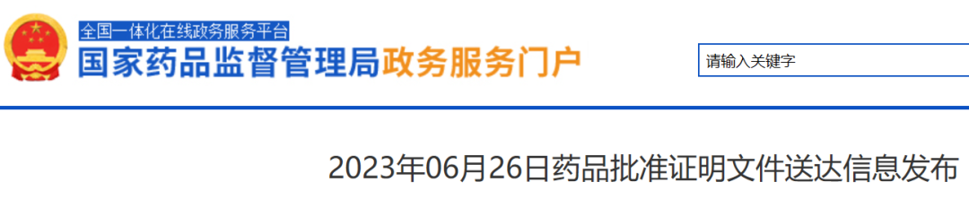 [1]2023年06月26日药品批准证明文件送达信息发布 . Retrieved Jun 26, 2023, from https://www.nmpa.gov.cn/zwfw/sdxx/sdxxyp/yppjfb/20230626133635185.html