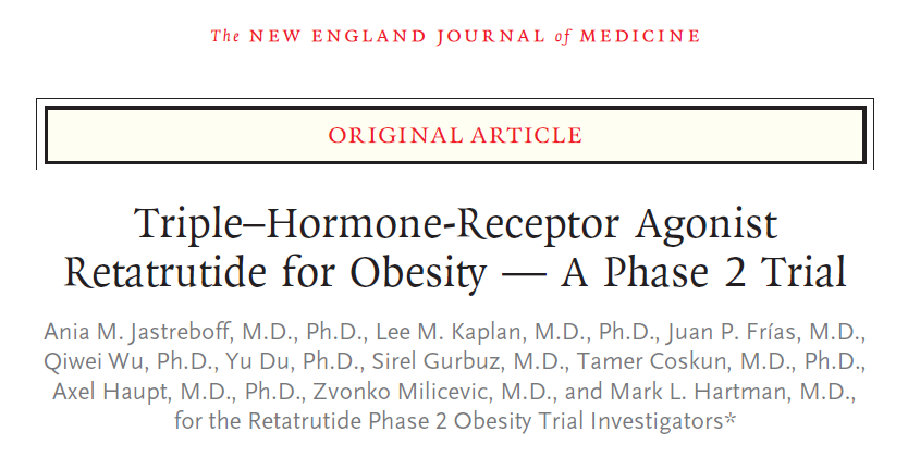 2023年6月26日,礼来公司在《新英格兰医学杂志》(NEJM)发表了题为:Triple–Hormone-Receptor Agonist Retatrutide for Obesity — A Phase 2 Trial 的临床研究论文。