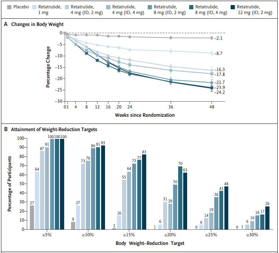 在这项双盲、随机、安慰剂对照的2期临床试验中,参与者是BMI≥30,或BMI在27-30之间但并至少伴有一种体重相关疾病(糖尿病除外)的成年人。参与者按照2:1:1:1:2:2的比例随机分配接受皮下注射Retatrutide注射治疗,剂量分别为1mg、4mg(初始剂量2mg)、4mg(初始剂量4mg)、8mg(初始剂量2mg)、8mg(初始剂量4mg)、12mg(初始剂量2mg)。临床试验主要终点是体重从基线到24周时的百分比变化。次要终点包括从基线到48周体重变化的百分比,体重减少≥5%、≥10%、≥15%的比例,以及治疗的安全性。