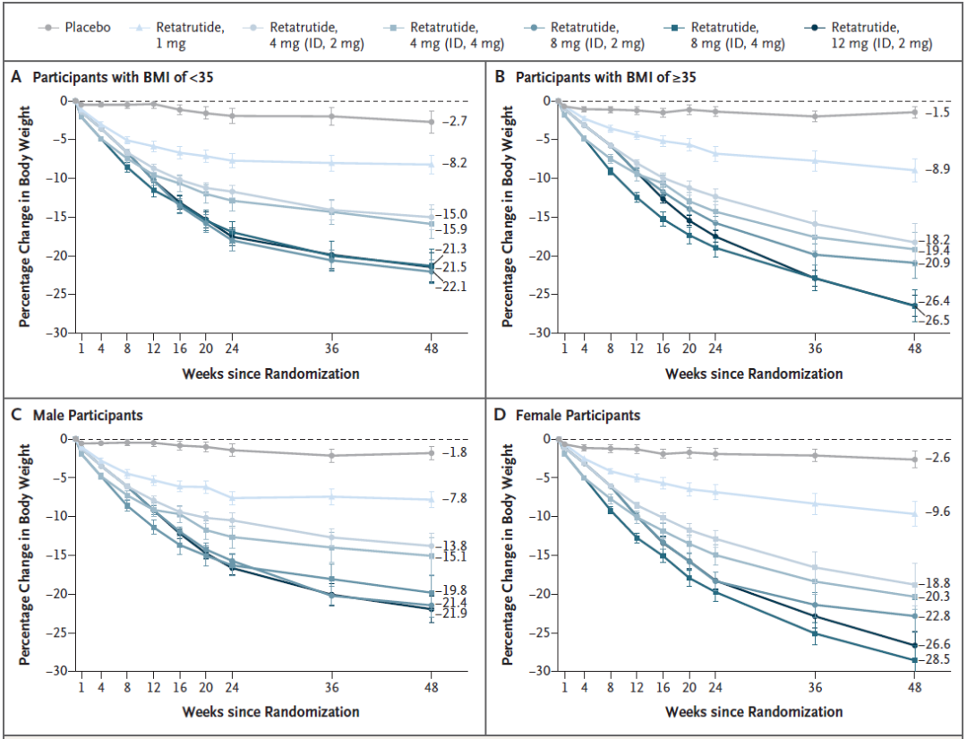 对接受治疗的肥胖患者的亚组的分析显示,Retatrutide治疗对BMI≥35的肥胖患者的减重效果更显著,12mg剂量在48周时让体重减轻了26.5%。此外,Retatrutide治疗对女性的减肥效果更好,8mg剂量在48周时让体重减轻了28.5%。